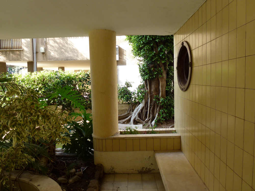 מסלול הכניסה מהרחוב אל הבית הינו מעבר הדרגתי מן החוץ אל הפנים, מאזור שטוף שמש – הגינה – לאזור של חצי צל – חצר מגוננת – ועד לאולם המבואה בו שורה צל מלא. הגינה היא שטח מגונן חשוף לשמש, בדרך כלל ברוחב 4 מ', הנמצא בין קו הבנין לקו המגרש. גדר חיה משולבת עם גדר בנויה מגדירה את הגבול בין המתחם השייך לדיירי בית הדירות, לבין השטח הציבורי שבחוץ. קוו הרחוב מתקבל על ידי רצף הגדרות המשולבות האלה, כאשר לעיתים קרובות קיים שער פיקוסים גזום ליד שער ושביל הכניסה למתחם. שטחה קטן, ותפקידה לגרום לכך שהבנין ייראה כאילו צומח מתוך הגינה, לפי חזונו של האדריכל הנודע לה קורבוזייר. וכן, מלווה הגינה את המעבר בשביל הכניסה. קומת העמודים, השלב הבא, נפתחת לחלל מקורה שהוא בו-זמנית גם חצר וגם גן. חצי הצל מבטיח תנאים נוחים ונעימים בקיץ, עם אפשרות לצפות לכיוון הרחוב ההומה מנקודת מבט מוגנת יחסית. יש בקומת העמודים מגוון ריצופים, וכן ערוגות גזורות בריצוף או בנויות, בריכות נוי, ספסליים. רק צמחיה עמידה לחצי צל וליובש יכולה לשרוד בתנאים השוררים בקומת העמודים.